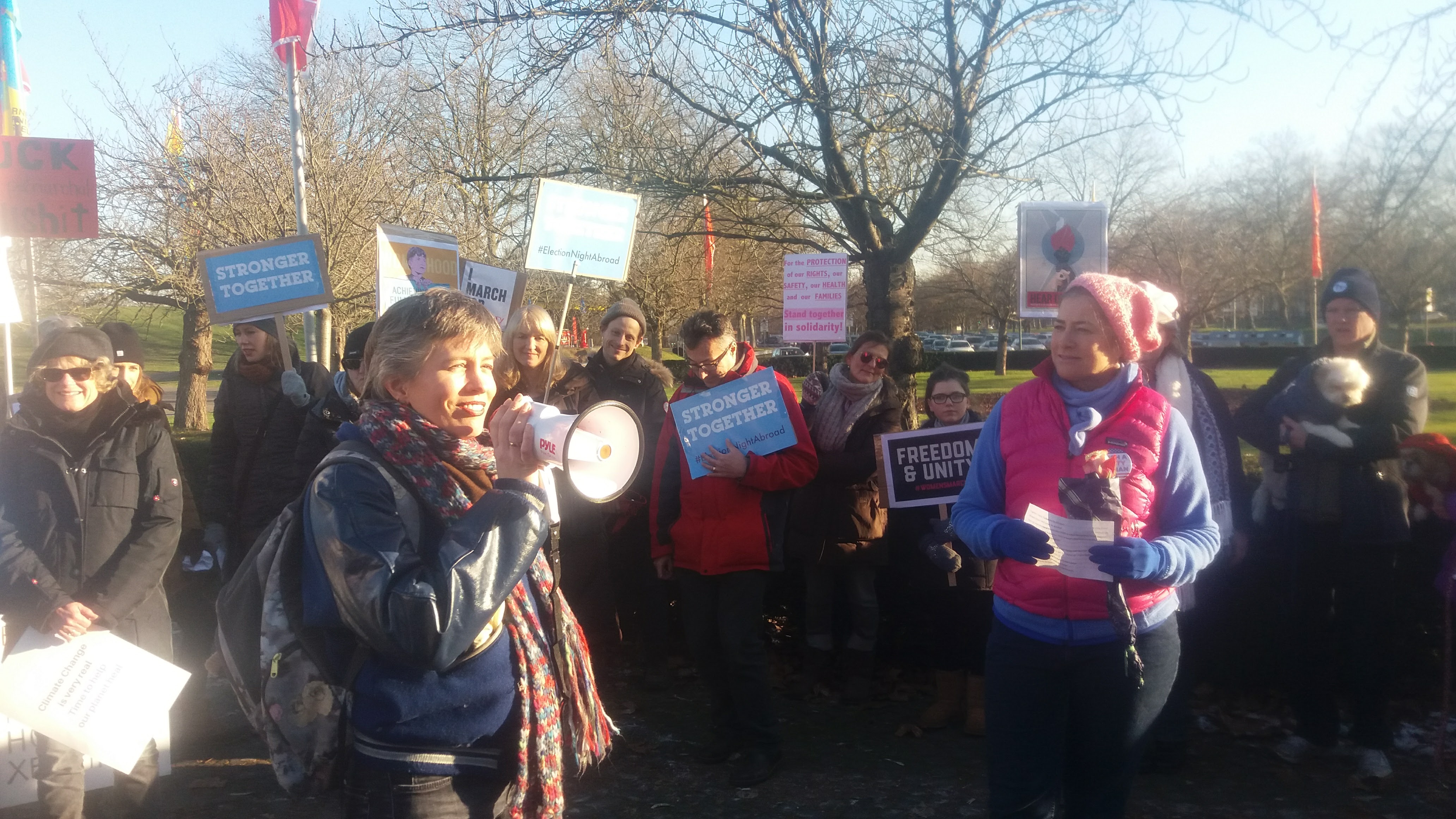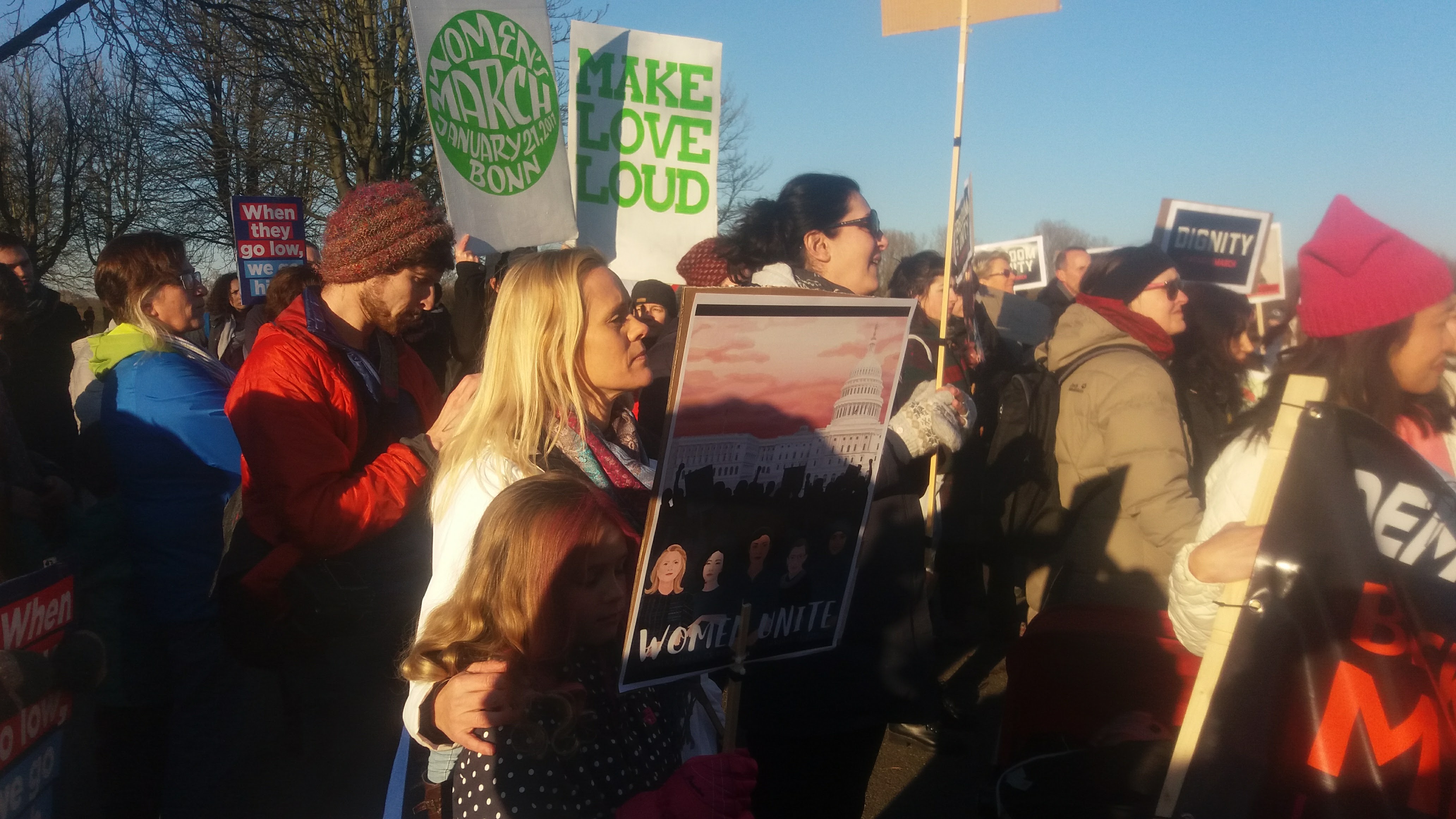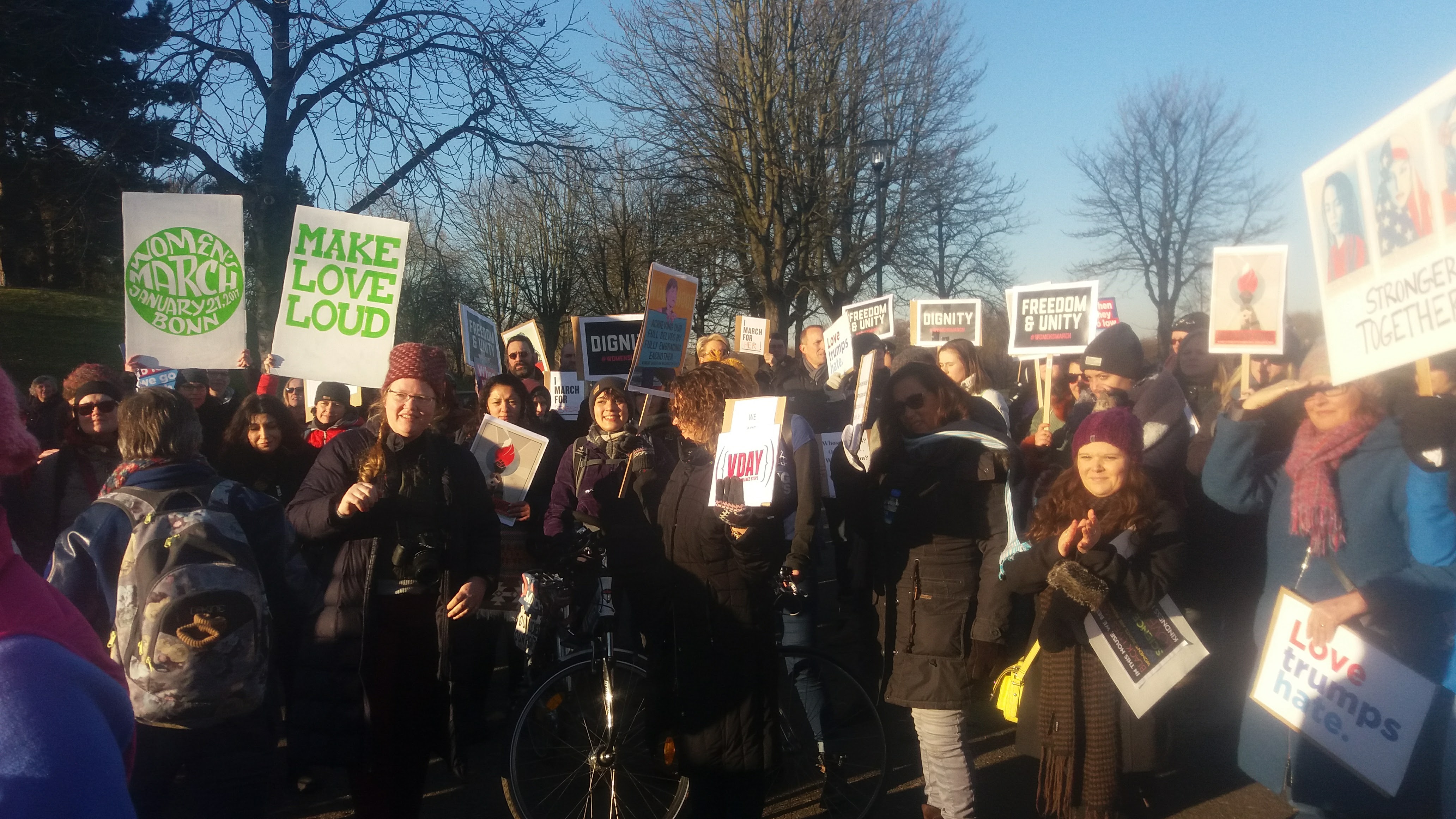 Ole Tangen Jr., ein Journalist aus New Jersey, der seit 10 Jahren in Bonn lebt und mit einer Deutschen verheiratet ist, erklärte: „Ich bin ein Sohn, Ehemann und Vater einer Tochter. Ich bin auch hier, um zu sagen, wie lächerlich es ist, dass wir im Jahre 2017 noch bzw. wieder für Frauenrechte demonstrieren müssen“.