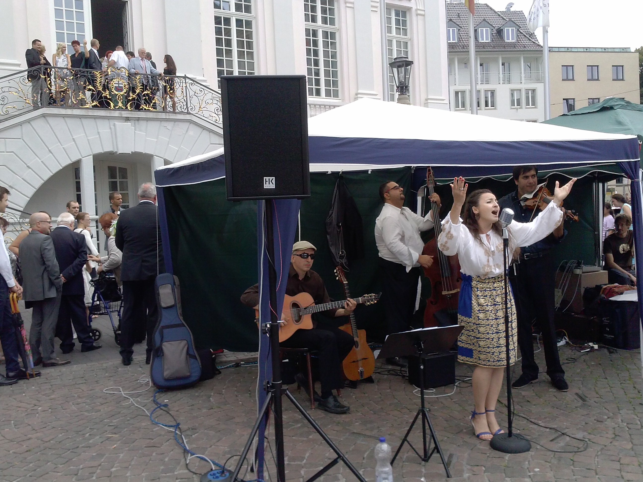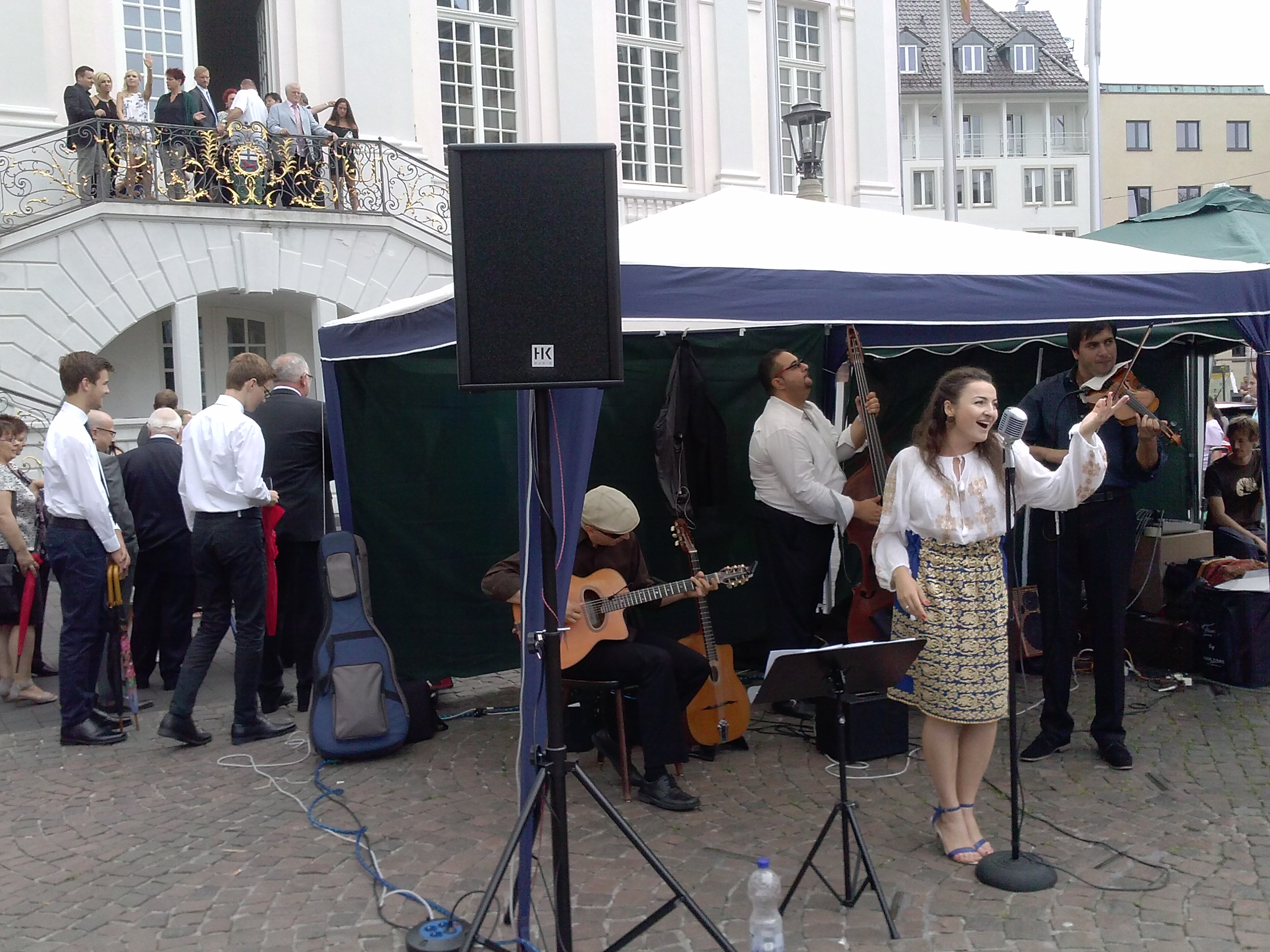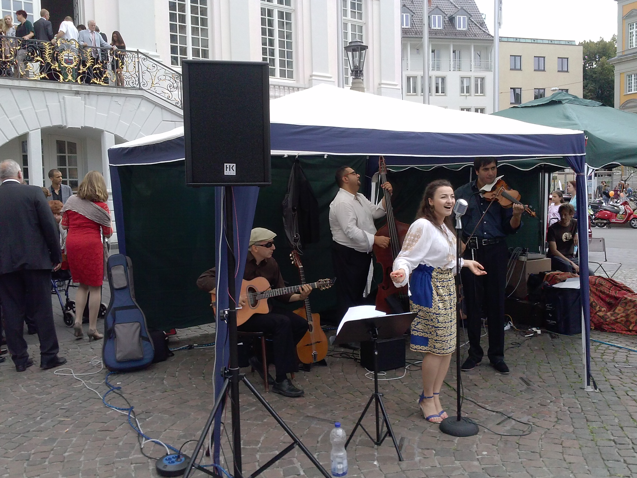 Stadtmusik am Samstag, 15.08. – Kulturdezernent Martin Schumacher hat gemeinsam mit dem Rock- und Popbeauftragten der Stadt Bonn, Hans-Joachim Over, dem Institut francais, dem Deutschen Musikrat und verschiedenen Bonner Veranstaltern als Partner auch in diesem Jahr die eine eigene Konzertreihe umgesetzt. Vom 8. August bis 5. September präsentieren insgesamt 23 Künstler und Bands Livemusik umsonst und draußen. Auf dem Marktplatz eröffnet direkt vorm Rathaus das Ensemble Bukarest Bohème die Jazzbäckerei Open Air. Sängerin Ana Maria Leistikow begeistert mit ihrem nuancierten Vortrag rumänischen Volkslieder, Tangos und Chansons, wie sie einst die legendäre Maria Tănase stilsicher interpretierte.