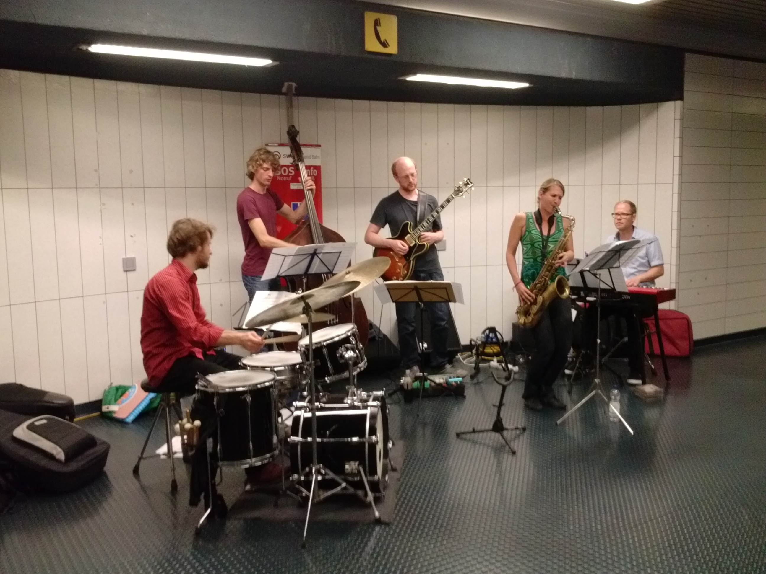 Die Jazz Tube hält an der U-Bahn-Haltestelle Hauptbahnhof – Thomas-Mann-Straße. Hier spielt um die Mittagszeit ein Quintett um die französische Saxophonistin Christine Corvisier eigene energiegeladene und trotzdem immer wieder improvisiert- frei schwebende Kompositionen wie „Bankrupt“.