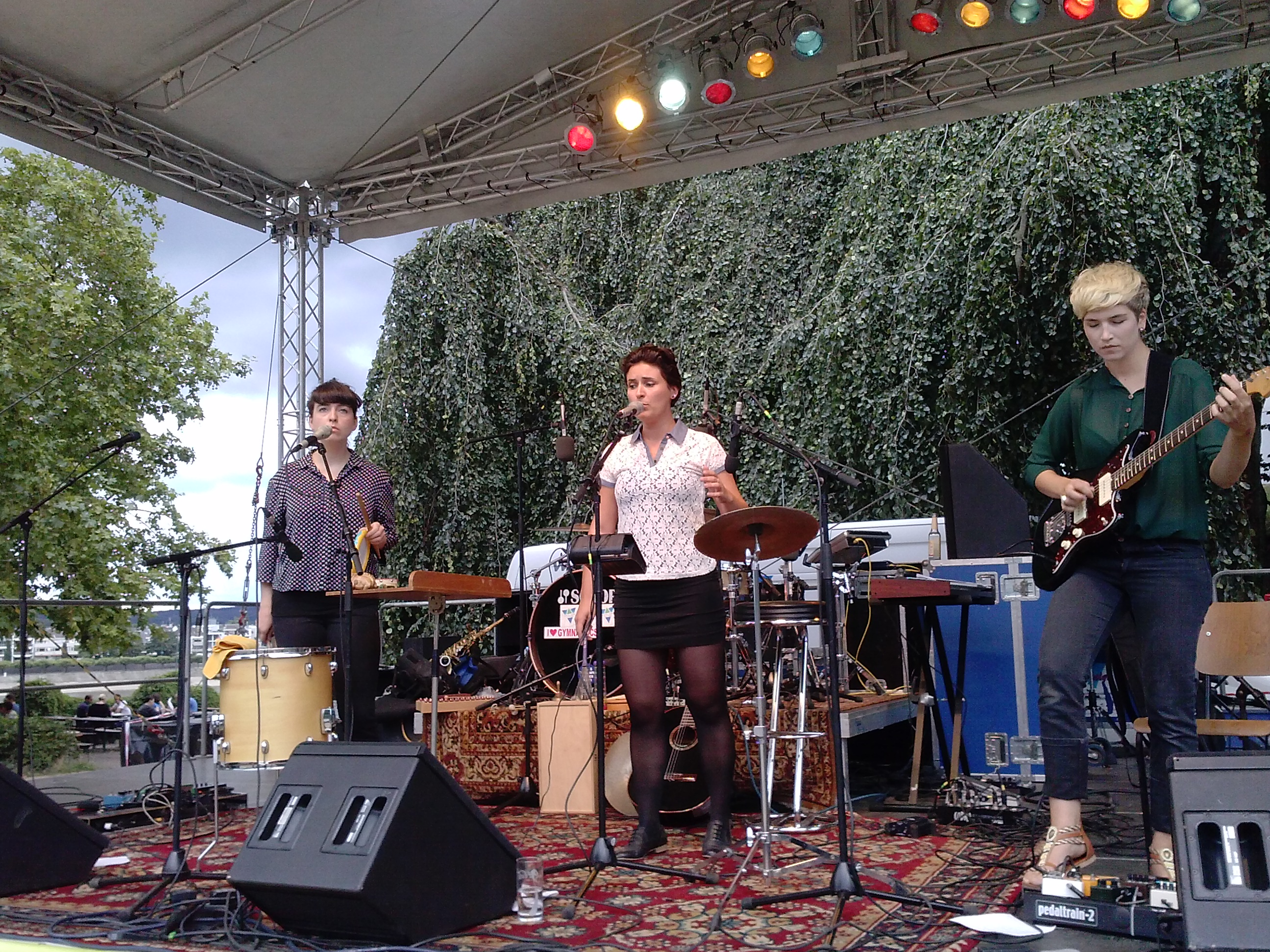 Im Stadtgarten spielt das Dresdner Trio Coucou schließlich Kammerpop vom Feinsten. Melancholische Arrangements mit oft zweistimmigem Gesang der Sängerinnen Meryem Kilic und Janda Struch und vielfacher Einsatz ungewöhnlicher, filigraner Instrumente sowie Steffi Narr an einer Folkgitarre und einer Loopstation schmeicheln den Gehörgängen. Coucou lädt mit Charme und schattierungsreich sauber aufeinander abgestimmten Gesangsharmonien vor imposanter Rheinkulisse unter dicht verhangenen Wolkenhimmel spannungsvoll-schwelgerisch zum Träumen ein.